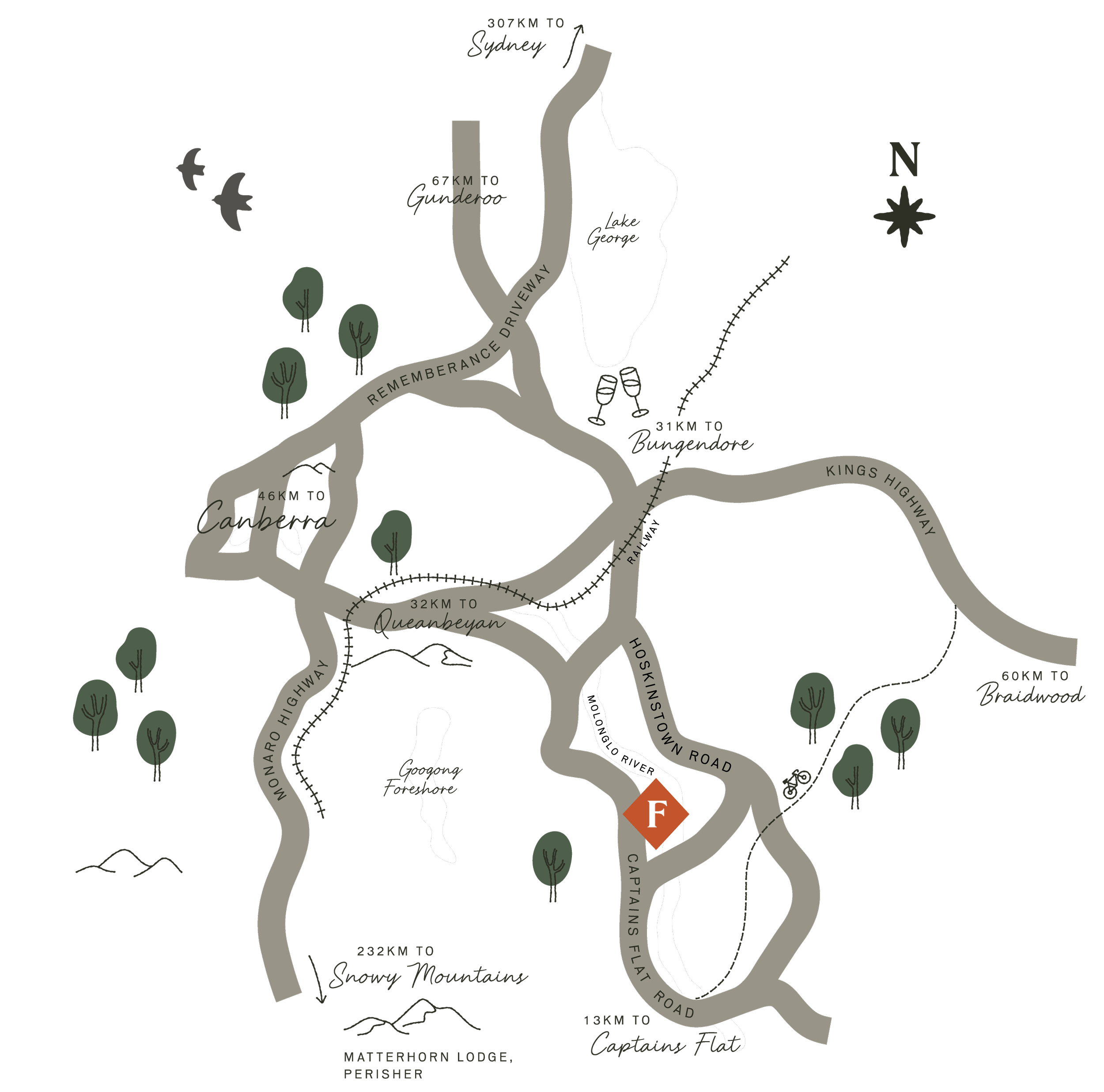 Discover seven marked trails throughout Foxlow’s landscape leading to the Snowy Woodland Conservation Zone, Goose Meadow Ruins, Captains Flat Railway, Foxlow Bridge, and the Shearing Shed.